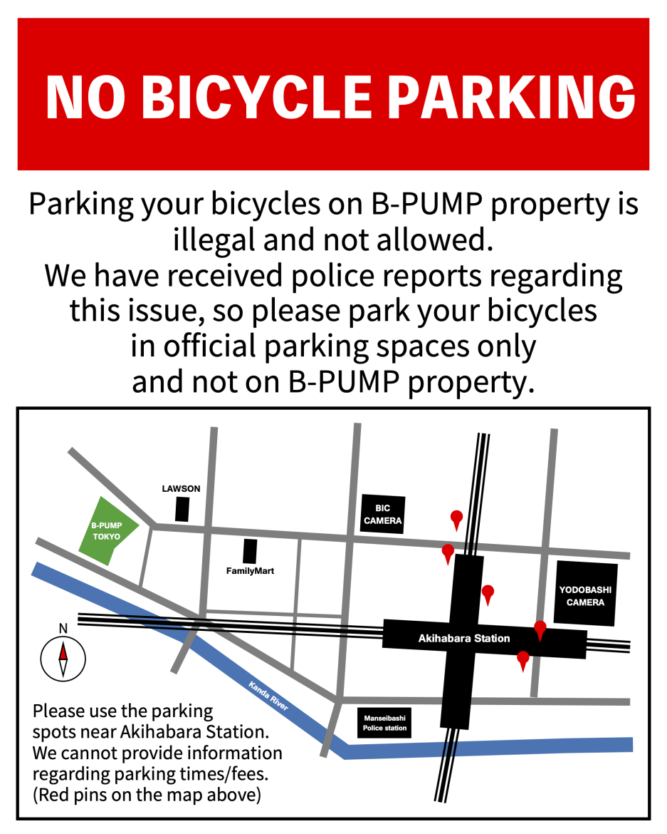 自転車は駐輪場に停めてください。B-PUMP TOKYO敷地内であっても駐輪禁止とします。