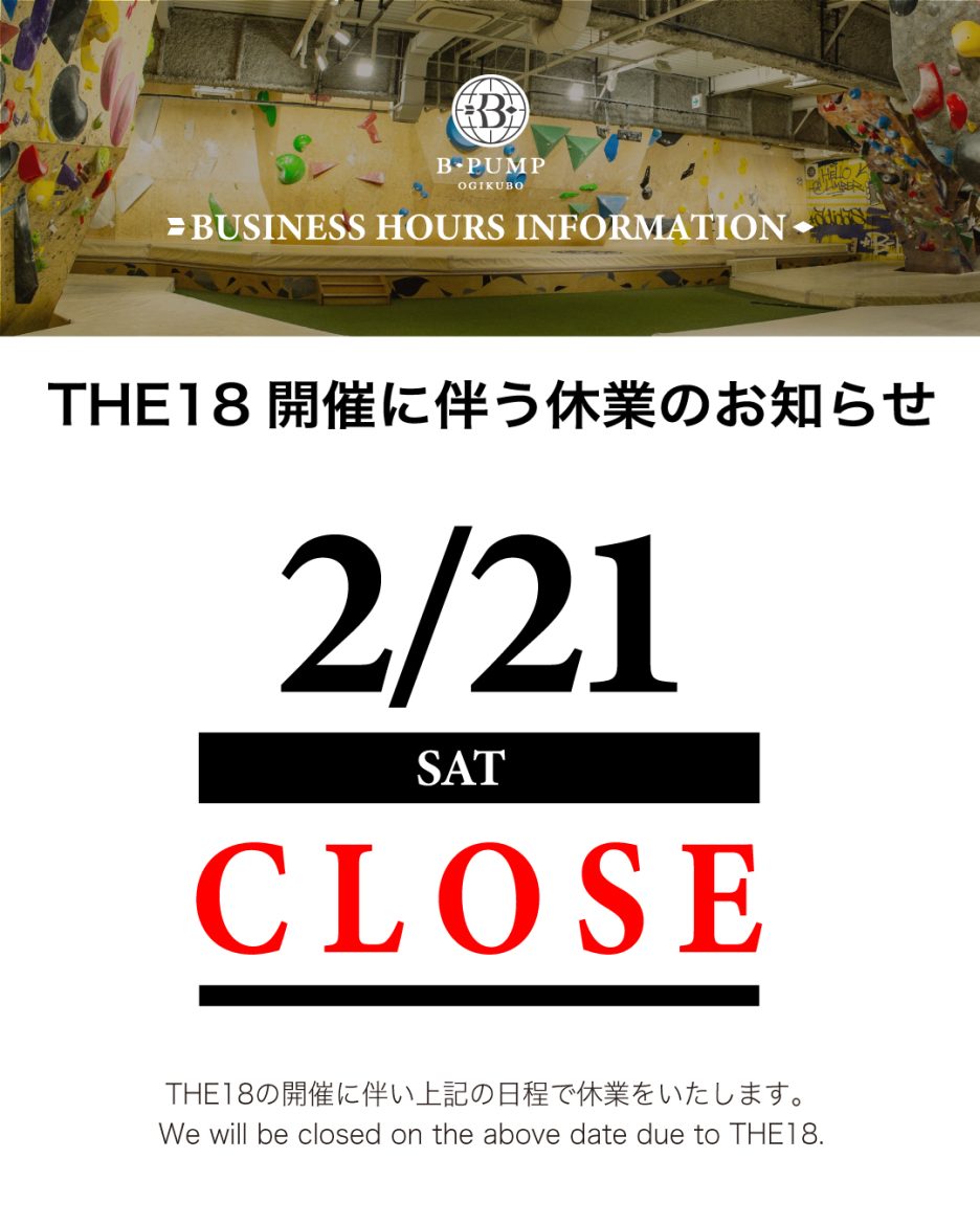 THE 18の開催に伴い、2/21(土)は休業となります。