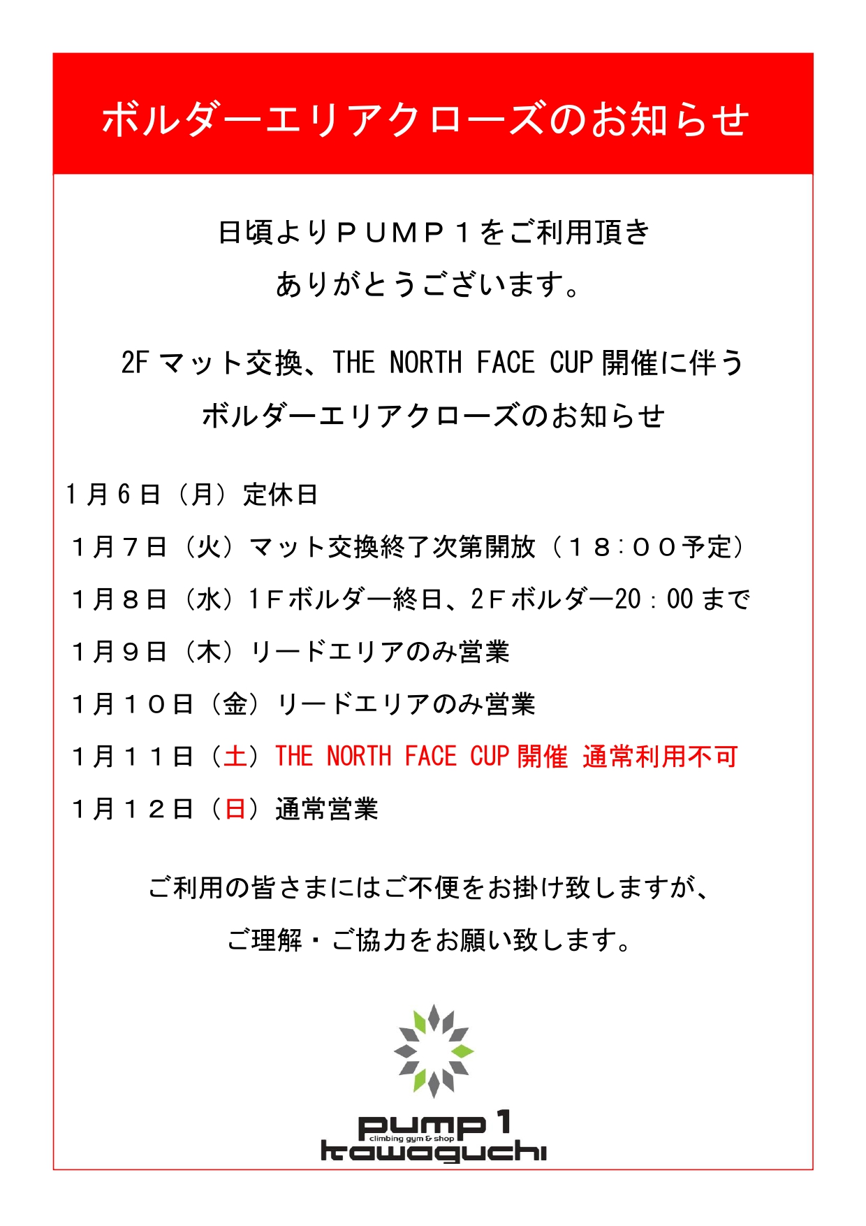 1月11日(土)は、“TheNorthFaceCup2025 Round8 PUMP1川口”の