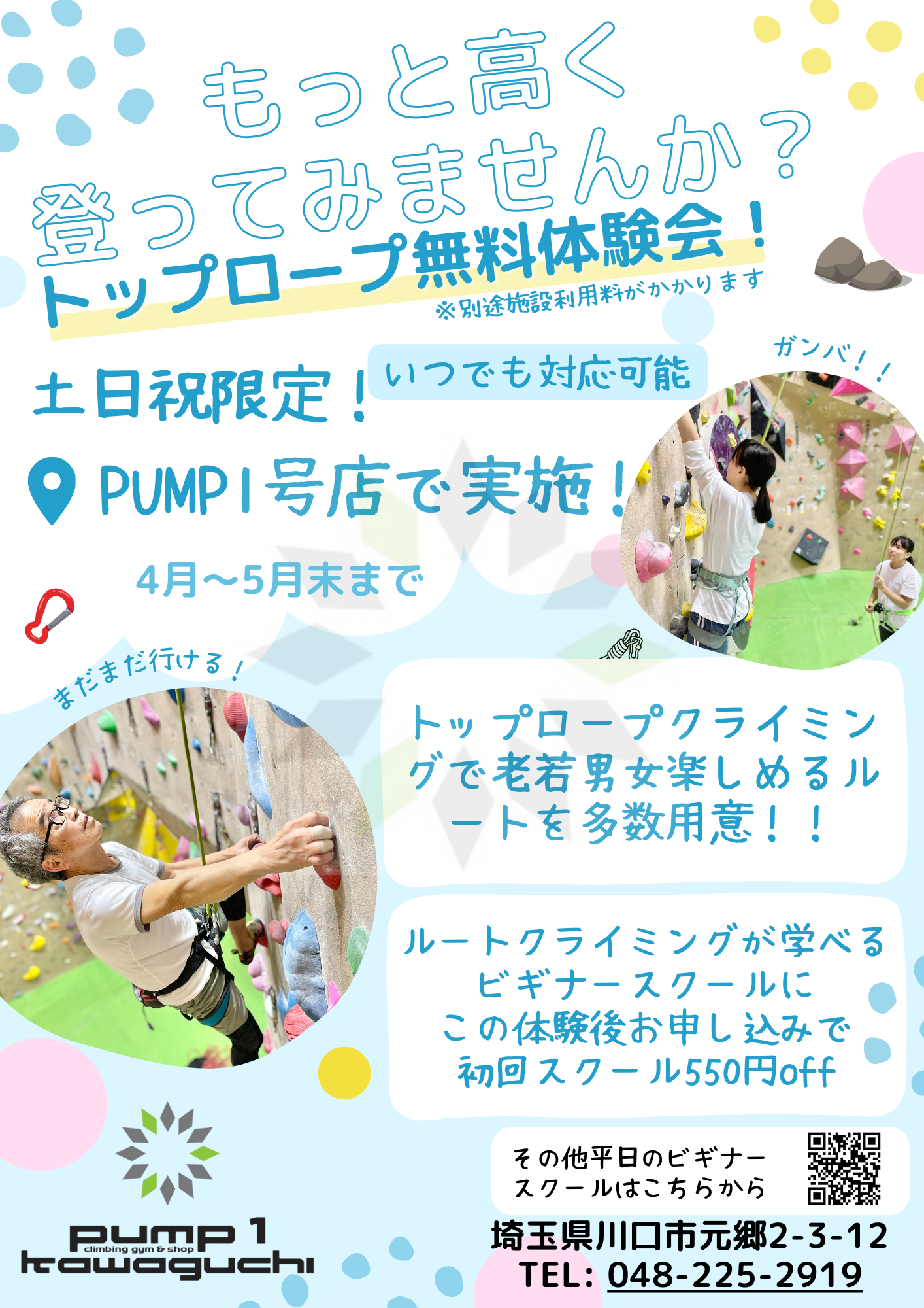 PUMP1では、土日祝日(平日も応相談)限定で、無料のトップロープ体験会を実施中!(別途施設利用料)