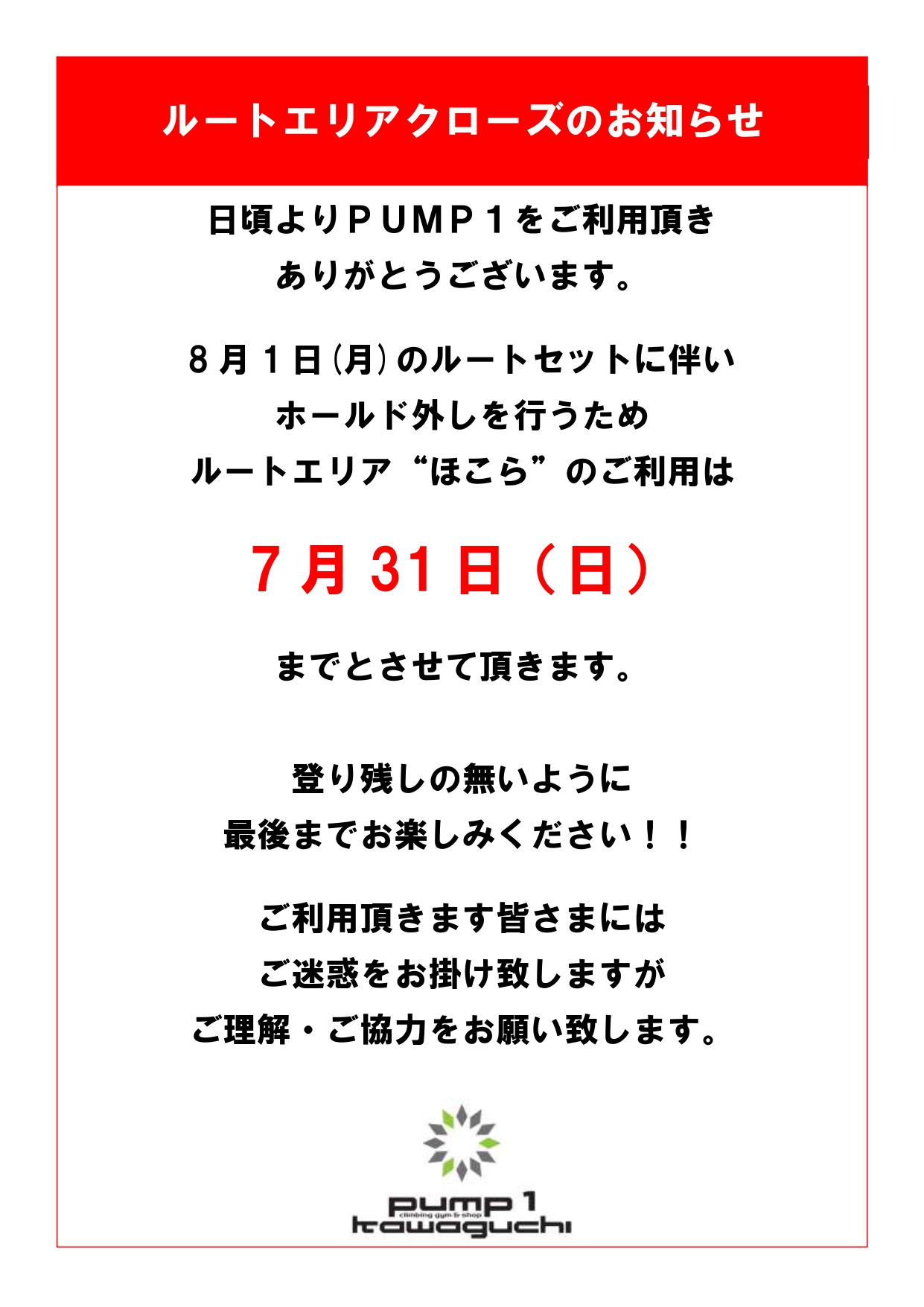 8月1日(月)にルートセットを行うため、ルートエリア”ほこら”