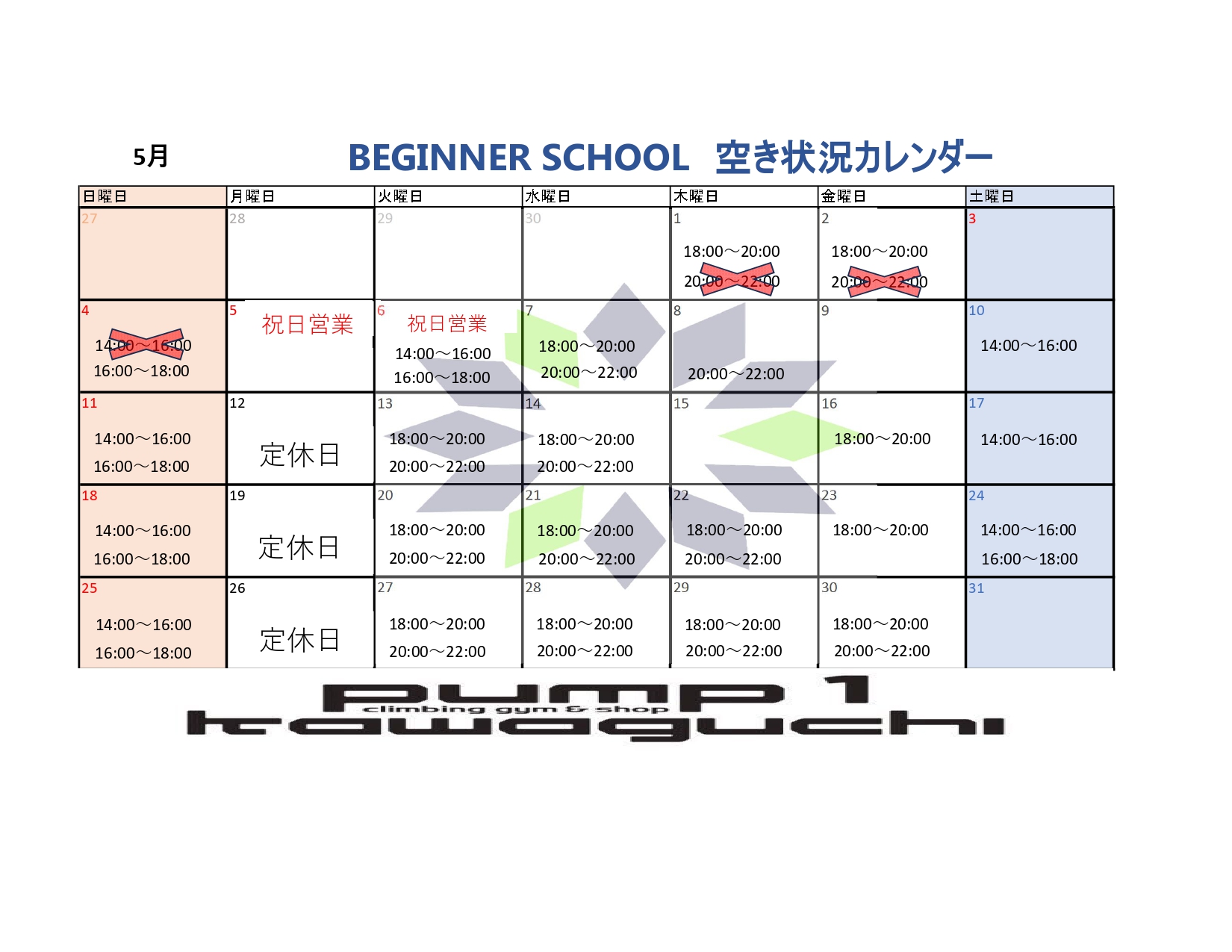 五月のビギナースクールの空き状況カレンダーが更新されました!!