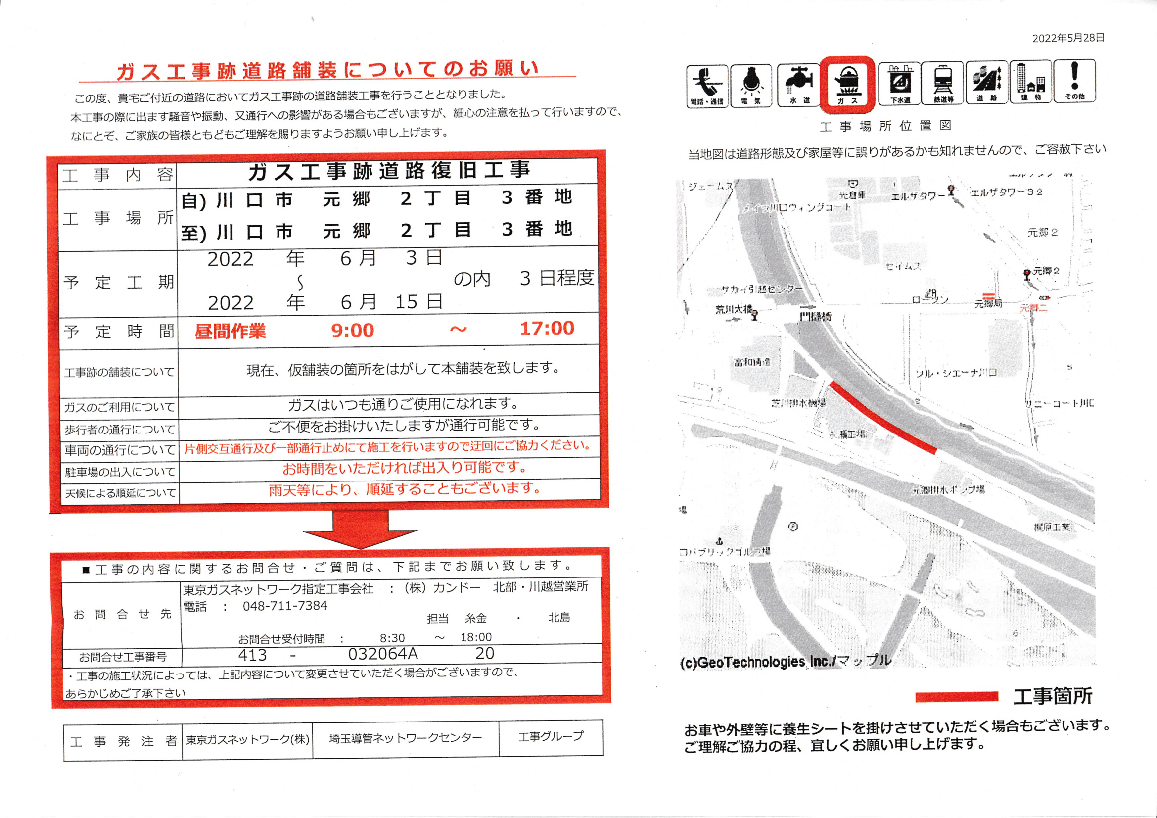 工期は、6月3日(木)~6月15日(火)の9時~17時 天候により計3日間程度の予定です。