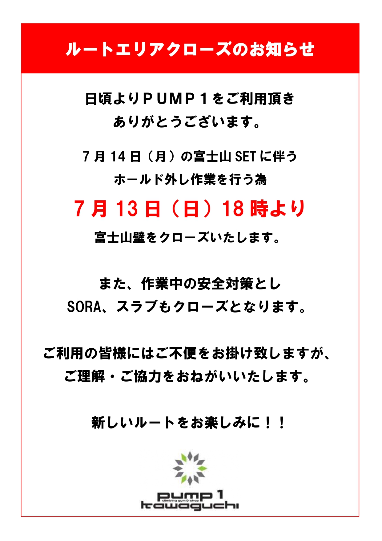 7月13日(日)18時より、冨士山をクローズ致します。