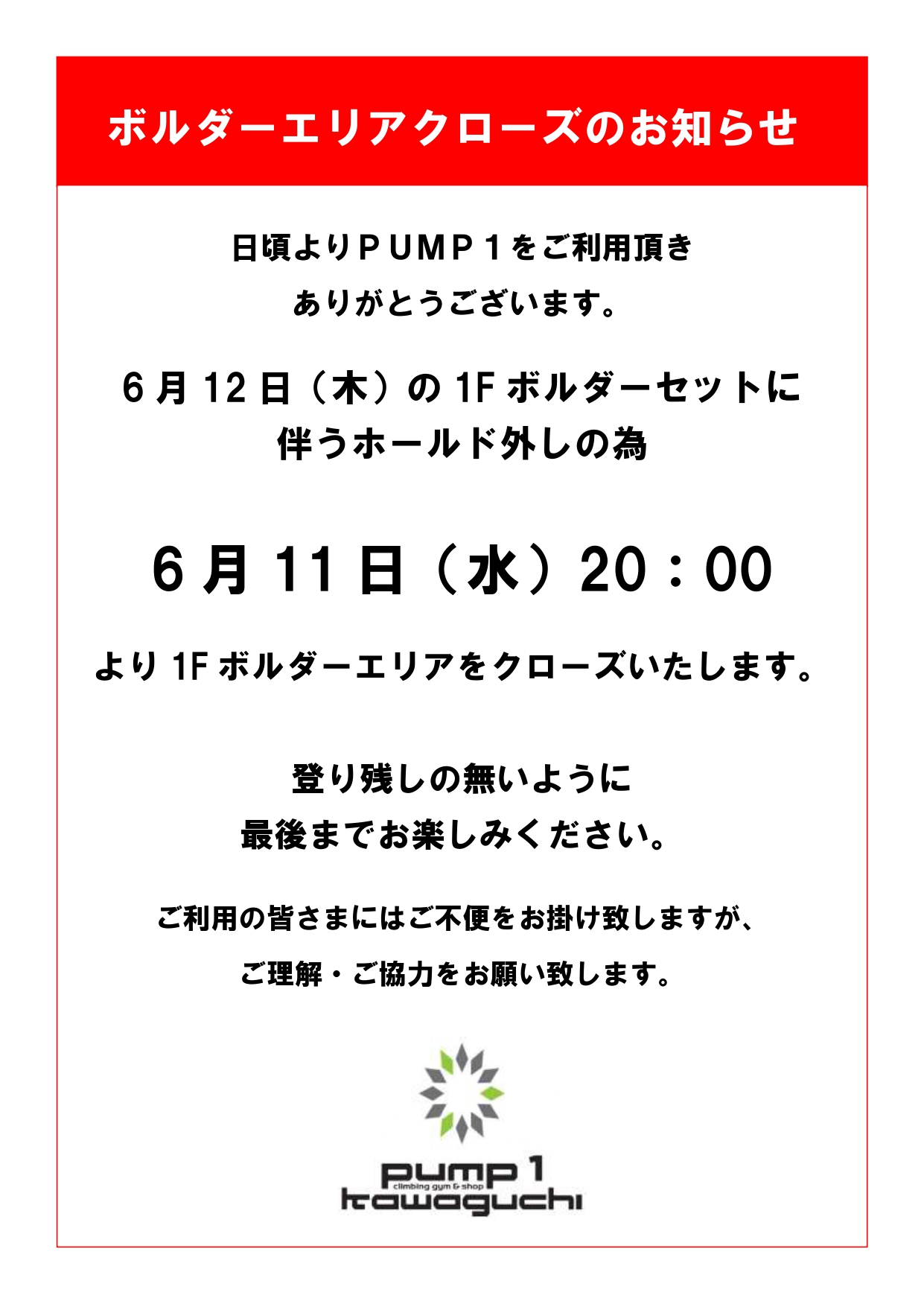 それに伴い、6月11日20時よりボルダーエリアをクローズ致します。