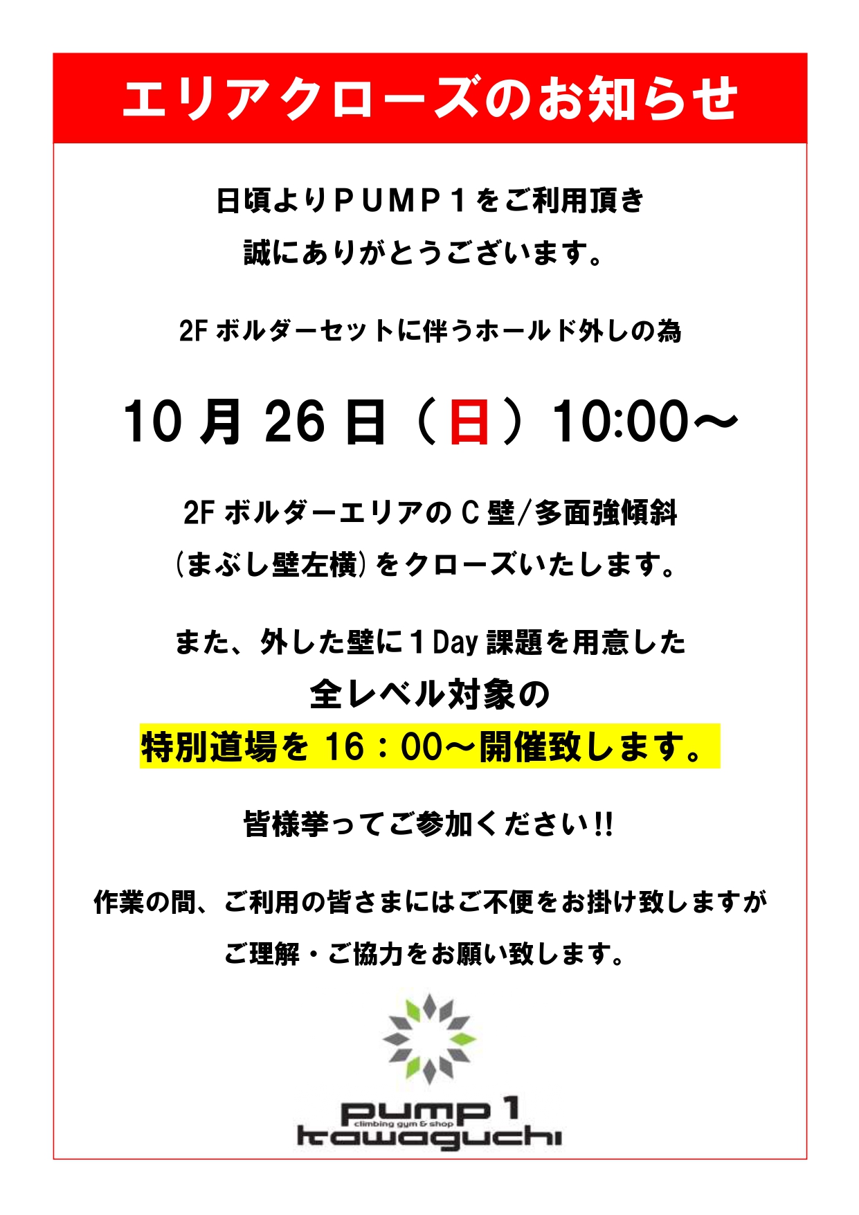 今週の日曜日10/26は1DAY課題をC壁にてご用意するので是非お越しください!!