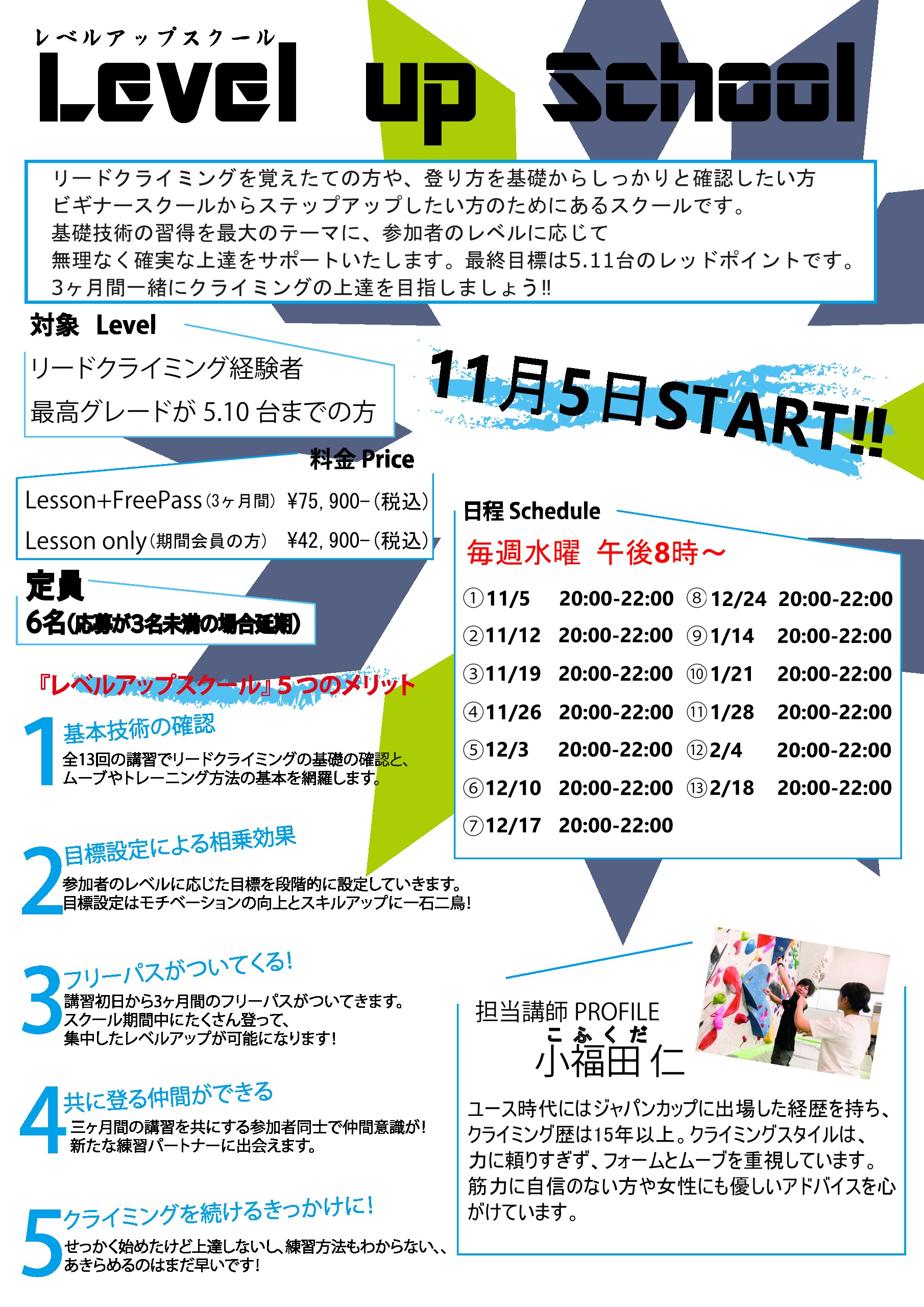 1日2時間の講習を13回を行います。これを受ければクライミングが上達+クライミング仲間が出来ること間違いなし!